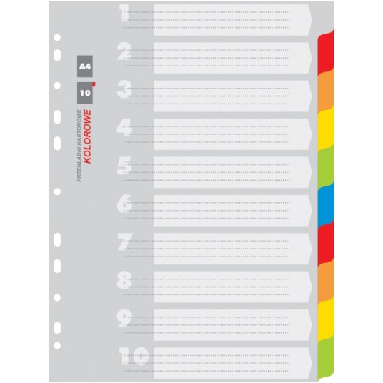 - wykonane z kartonu o gramaturze 200 g/m2 uzyskanego na drodze recyklingu - wyposażone w kartę informacyjno - opisową - pakowane jednostkowo w folię ochronną - format: A4 - dziurkowanie: 11 otworów - kolor przekładki odpowiada kolorowi indeksu - wymiary: 227 x 297 mm