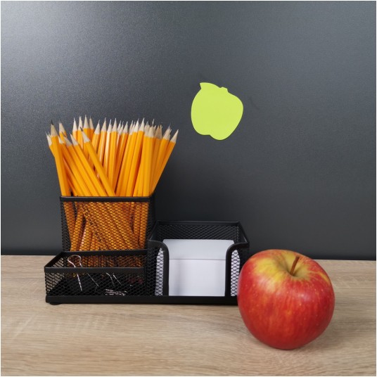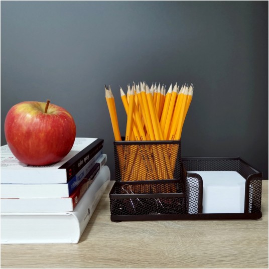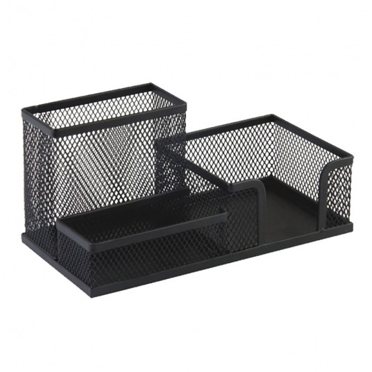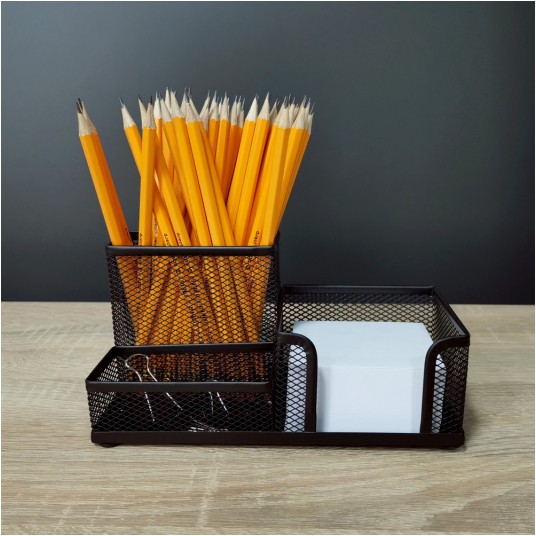 Wyposażony w 3 komory: 1 komorę na artykuły piśmienne, 1 komorę na karteczki oraz 1 na drobne akcesoria biurowe np. spinacze, zakładki, korektory.