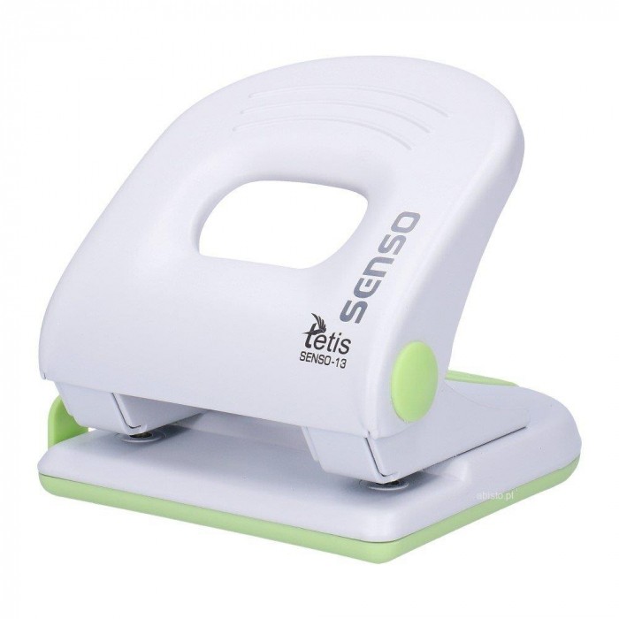 Biurowy, metalowy dziurkacz z wykończeniami z tworzywa sztucznego.