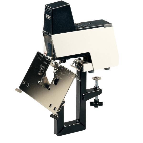 Zszywacz do zastosowań poligraficznych, do broszur, prospektów, zeszytów. Dzięki przestawianemu stolikowi może zszywać płasko i zeszytowo. Może pracować w zespołach kilku sztuk jednocześnie, po zastosowaniu dodatkowej szyny sprzęgającej (opcja dodatkowa). Komplet zawiera zszywacz ze stolikiem i pedałem wyzwalającym oraz wkładką do zszywek płaskich.