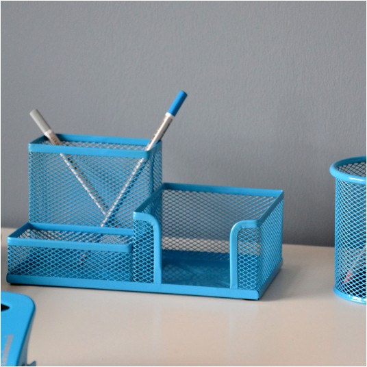 Metalowy przybornik na biurko służący do organizacji miejsca pracy.