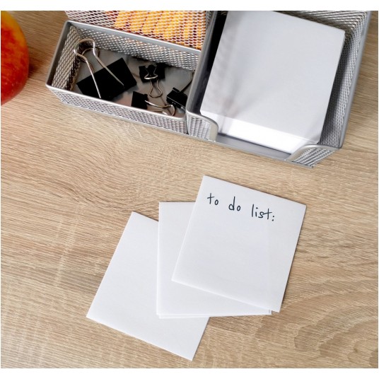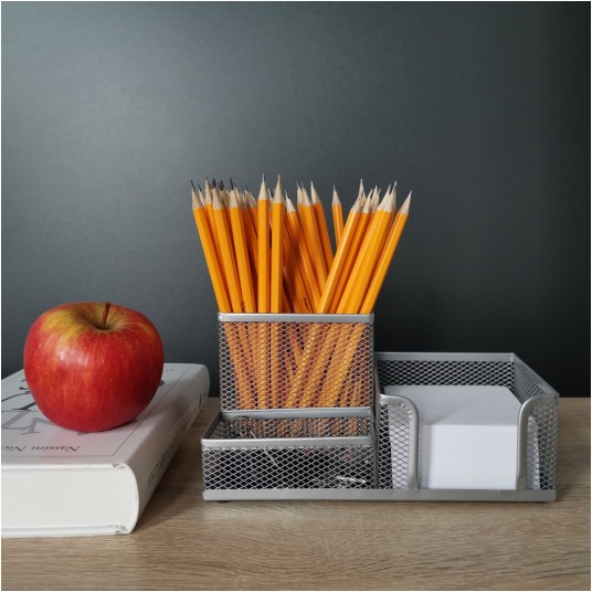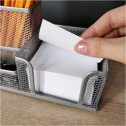 Wyposażony w 3 komory: 1 komorę na artykuły piśmienne, 1 komorę na karteczki oraz 1 na drobne akcesoria biurowe np. spinacze, zakładki, korektory.