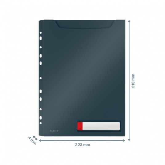 Składany pasek z perforacją pozwala na wpięcie koszulki do segregatora lub używanie jej jako oddzielnej teczki na dokumenty