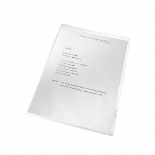 Folder A4 do przenoszenia, zabezpieczania i prezentacji dokumentów z łatwym dostępem do zawartości dzięki otwieraniu z góry i z prawej strony.