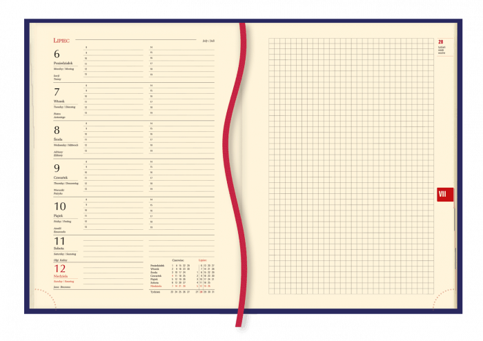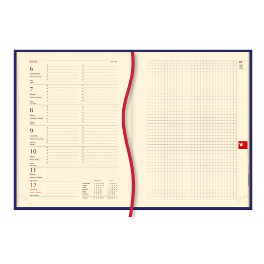 - układ kalendarium: 1 tydzień - 1 strona + strona na notatki