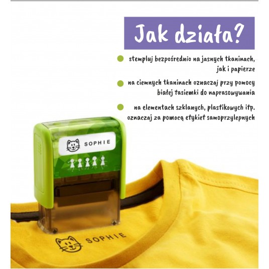 Przebadany dermatologicznie, trwały tusz zostawia wyraźne i trwałe odbicia, odporne na pranie i zmywanie w zmywarce, zarówno bezpośrednio na ubraniach, etykietach do naprasowywania i trwałych naklejkach.