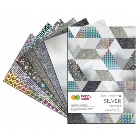 Zawiera arkusze grubego papieru z efektami holograficznymi (3 motywy – gwiazdki, kwadraty, kropki), mieniącymi się różnymi kolorami w zależności od kąta padania światła – 230g; metalizowany typu lustro, który odbija światło – 230g; papier brokatowy w 2 odcieniach, mieniący się i dający niezwykłe wrażenie – 150g.
