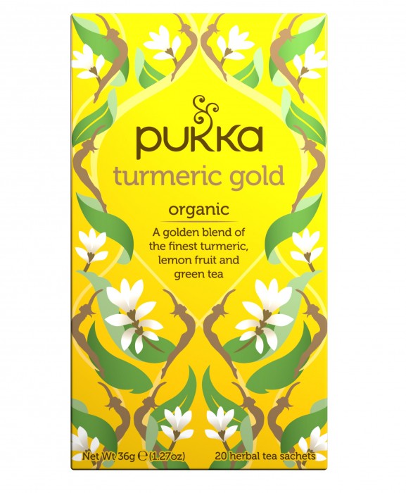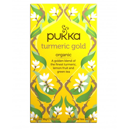 Herbata Turmeric Gold to kompozycja składająca się z liści zielonej herbaty oraz ziół – korzenia kurkumy i lukrecji, nasion kardamonu, cytrynowego liścia tulsi.