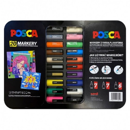 Odkryj nieograniczone możliwości artystyczne dzięki zestawowi 20 markerów POSCA, umieszczonych w eleganckim metalowym etui