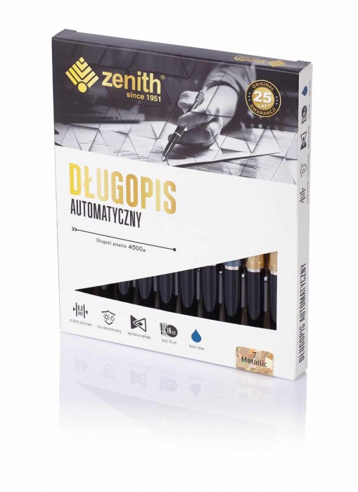 Długopis automatyczny z niklowanymi elementami - korpus wykonany z błyszczącego tworzywa sztucznego - obudowa dzielona w 1/3 wysokości (górna część ośmiokątna), obie części korpusu oddzielone mosiężno$niklowaną obrączką - charakterystyczny wielopłaszczyznowy klips wykonany z materiału utrzymującego sprężystość klipsa, bez wyginania się ani łamania - okuwka (dolny element mosiężno$niklowany) zintegrowana z korpusem - wymienny wkład wielkopojemny Zenith 4 z dokumentalnym tuszem gwarantującym trwałość zapisu na wiele lat - kolor tuszu: niebieski - długość linii pisania: 4500 metrów - grubość końcówki piszącej: 0.8 mm - kolor korpusu: błękitny