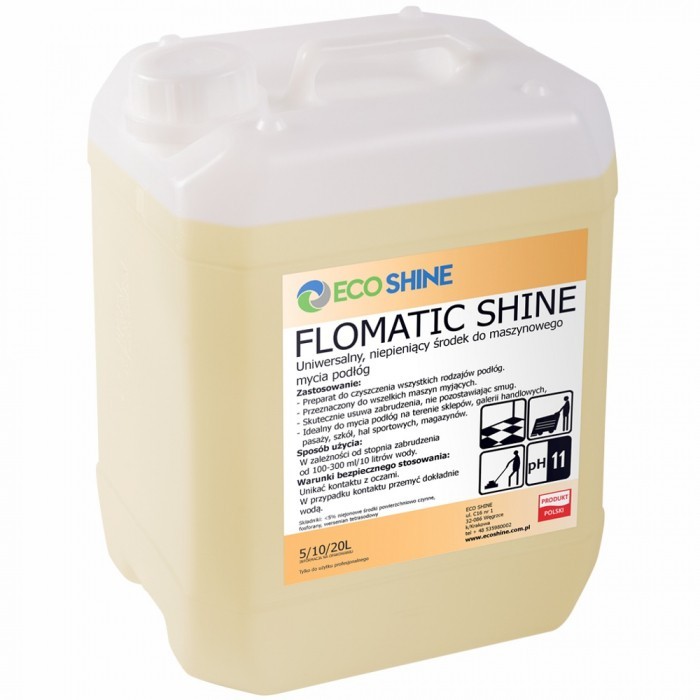 - Preparat do maszynowego i ręcznego mycia podłóg - Niepieniący, bezzapachowy - Preparat do czyszczenia podłóg odpornych na działanie wody - Przeznaczony do wszelkich maszyn myjących - Skutecznie usuwa zabrudzenia, nie pozostawiając smug - Całkowite odpienianie już w zimnej wodzie - Nie wymaga odpieniacza - Zgodny z HACCP nie zawiera barwników i perfum - Idealny do gastronomi, przemysłu spożywczego, kosmetycznego, farmacji - Idealny do mycia podłóg na terenie sklepów, galerii handlowych, pasaży, szkół, hal sportowych, magazynów - Nie zawiera alkaliów - Optymalny do mycia codziennego i gruntownego - Rodzaj czyszczenia: maszyny myjące, mycie ręczne - Zastosowanie: wszystkie powierzchnie odporne na działanie wody - Odradzane zastosowania: brak - Gęstość: 1,05 – 1,10 g/ml - pH koncentratu ok. 11 - Pojemność: 10l