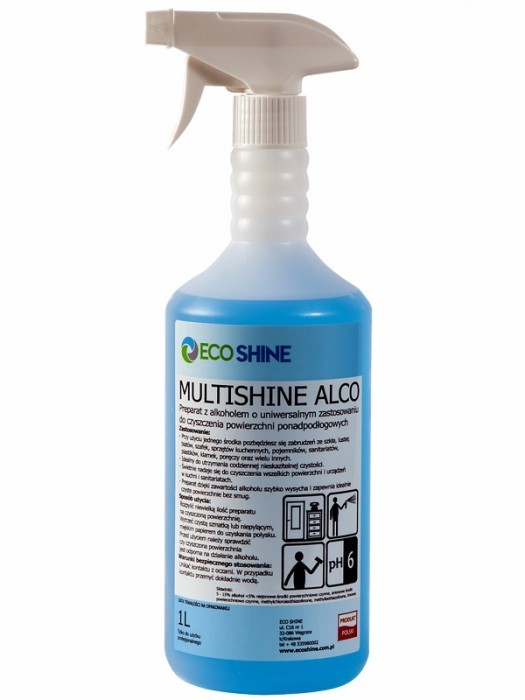 - Preparat z alkoholem o uniwersalnym zastosowaniu do czyszczenia wszystkich powierzchni ponadpodłogowych i przedmiotów odpornych na działanie alkoholi - Gotowy do użycia - Przy użyciu jednego środka pozbędziesz się zabrudzeń z szkła, luster, blatów, szafek, sprzętów kuchennych, pojemników, sanitariatów, plastików, klamek, poręczy oraz wielu innych - Idealny do utrzymania codziennej nieskazitelnej czystości - Świetnie nadaje się do czyszczenia wszelkich powierzchni i urządzeń w kuchni i sanitariatach - Preparat dzięki zawartości alkoholu szybko wysycha i zapewnia idealnie czyste powierzchnie bez smug - Pozostawia świeży, przyjemny zapach - Rodzaj czyszczenia: ręczne, pianowe - Zastosowanie: szkło, metal, plastik, kamień, skóra, drewno - Odradzane zastosowanie: powierzchnie wrażliwe na działanie alkoholu - Gęstość: ok. 0,9 – 1,0 g/ml - pH preparatu 6 - Pojemność: 1l