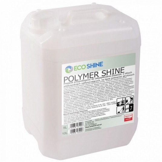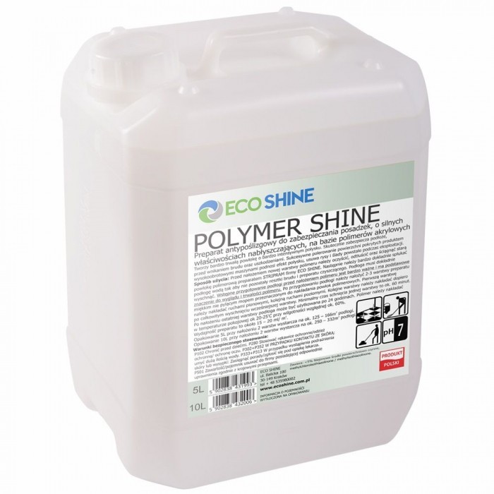 - Preparat do zabezpieczania posadzek na bazie polimerów akrylowych - Tworzy trwałą powłokę o intensywnym połysku - Skutecznie zabezpiecza powierzchnię przed brudem i uszkodzeniami - Jest odporny na ścieranie - Nie zwiększa poślizgowości podłogi - Polerowanie powierzchni pokrytej produktem Polymer Shine, zwiększa jej połysk, usuwa rysy i ślady powstałe podczas eksploatacji - Rodzaj nakładania: ręczne - Zastosowanie: linoleum, wykładziny PVC, winyl, kauczuk, epoksyd, posadzki przemysłowe betonowe, kamień, gres (w przypadku niewielkich fug, patrz instrukcja stosowania) - Gęstość: 1,0 g/ml - pH koncentratu: 7 - Pojemność: 10l