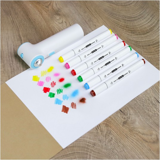 – wystarczy wsunąć pisak w dyszę i nacisnąć przycisk, żeby uzyskać efekt kolorowego sprayu