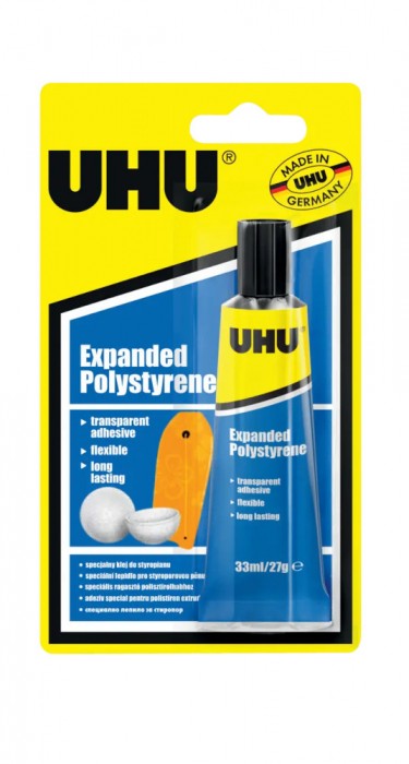 Klej do pianki polistyrenowej UHU Expanded Polystyren. Opakowanie 50 ml. Specjalnie opracowany szybkoschnący klej kontaktowym. Tworzy elastyczną, bezbarwną i wodoodporną spoinę, która jest wysoce odporna na starzenie. Do klejenia styropianu, np. Styropor®, również w połączeniu z innymi materiałami, np. drewno, papier, metal, ceramika, tynk, tkanina i różne tworzywa sztuczne. Nie stosować w temperaturze poniżej +5°C. Zawiera lotne, łatwopalne rozpuszczalniki, dlatego należy podjąć odpowiednie środki bezpieczeństwa podczas pracy i przechowywania. Klejone powierzchnie muszą być czyste, suche, odtłuszczone i bez kurzu. Klej należy nałożyć na obie klejone powierzchnie. Czas klejenia zależy od ilości nałożonego kleju i zdolności chłonnej klejonego materiału. 5 – 10 min od nałożenia kleju należy złączyć obie części ze sobą. Siła wiązania osiągalna jest po 72 godzinach. Do usuwania pozostałości kleju i zabrudzeń należy używać specjalnego rozpuszczalnika UHU lub lekkiej benzyny. Odporny na temperaturę od -30 °C do +70 °C. Prawidłowo zamknięty pojemnik przechowywać w suchym, chłodnym i zabezpieczonym przed mrozem miejscu.