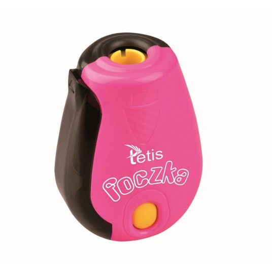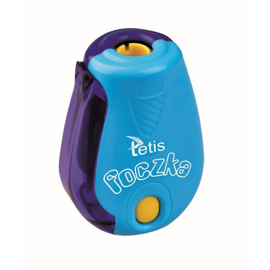- Wyposażona w stalowe ostrze, pojemnik na ścinki oraz przycisk, który automatycznie wysunie się, gdy ołówek, bądź kredka będą zaostrzone.
