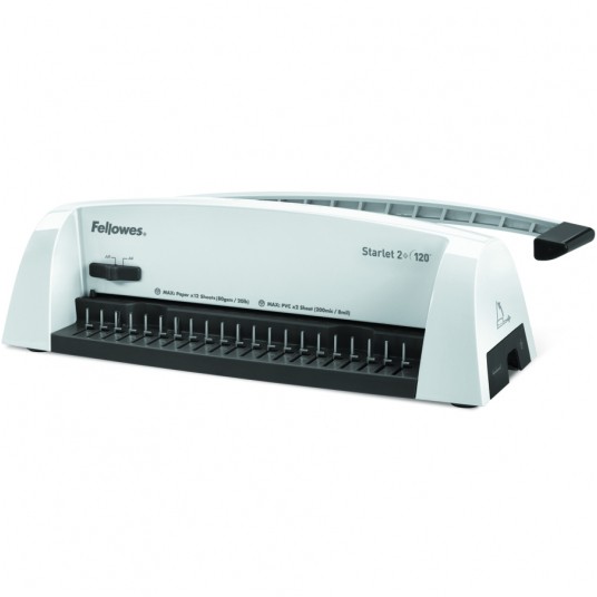 Fellowes Starlet 2+ 120 to niewielkich rozmiarów bindownica do oprawy dokumentów grzbietami plastikowymi do użytku w domu lub biurze przydomowym.