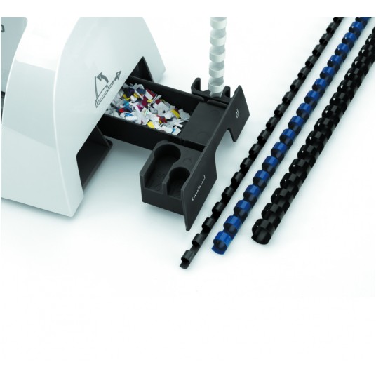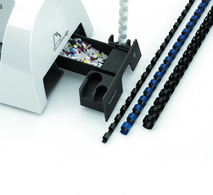 Wyposażona w specjalną szufladę na ścinki z opatentowanym systemem mierzenia grubości dokumentów i doboru odpowiedniego grzbietu.