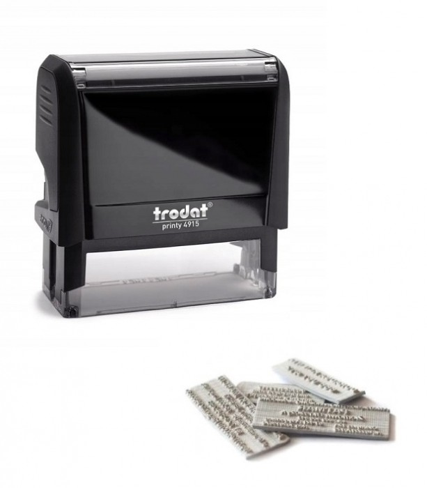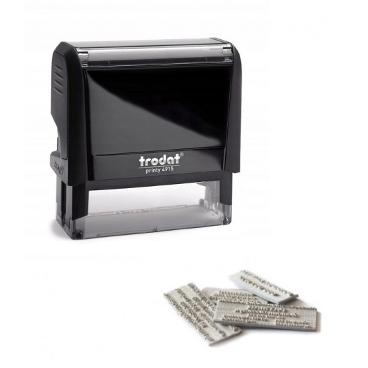 Kompletny zestaw gotowy do użycia, składa się z automatu Trodat, poduszki oraz gumki. Powierzchnia gumki stemplarskiej: 70 mm x 25 mm. Maksymalna ilość wersów: 6.