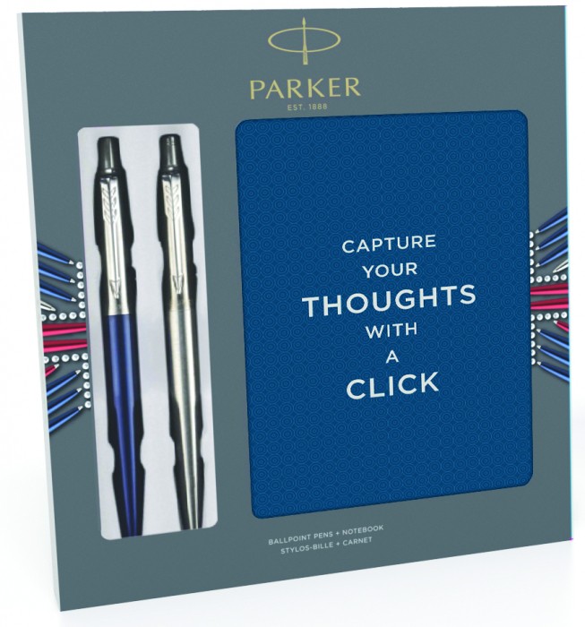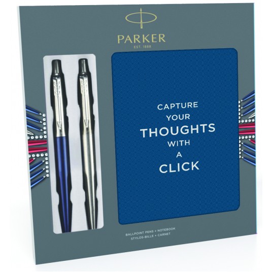 Zestaw składający się z: 2 tradycyjnych długopisów Parker Jotter oraz notesu.