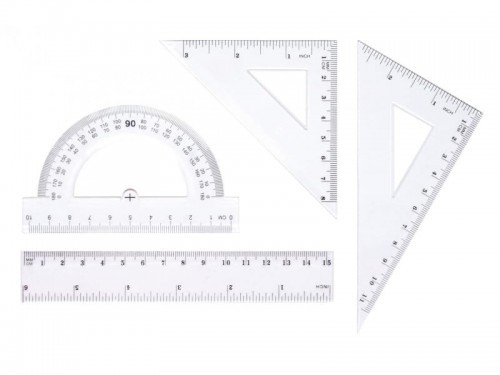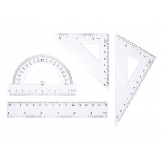 - Koplet zawiera 2 ekierki ( 11,5 i 8 cm), linijkę (15 cm) oraz kątomierz ( 10 cm).